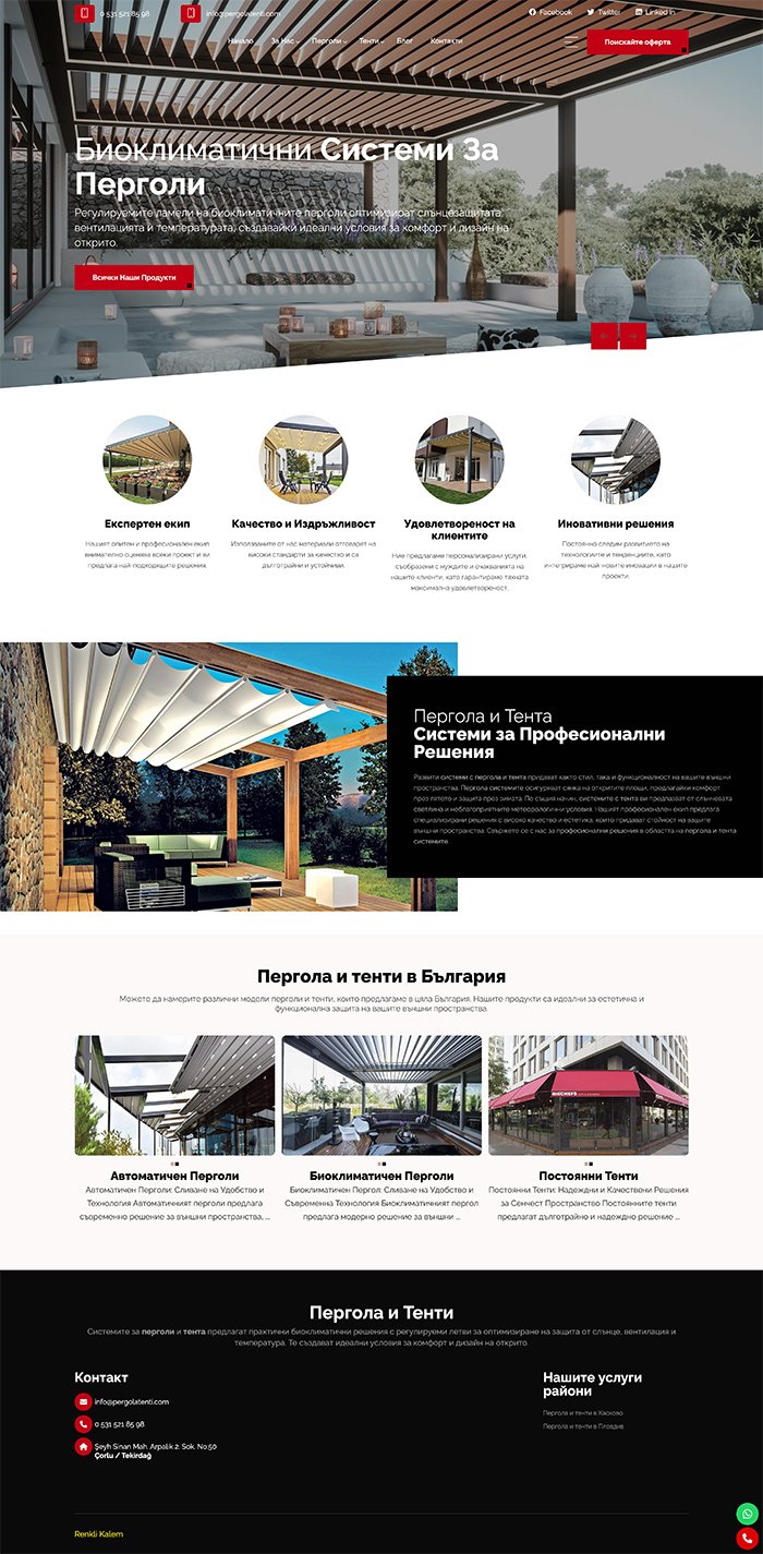 Renkli Kalem Web Tasarım Ajansı olarak, Bulgaristan’da pergola ve tente modelleri üretimi yapan Pergolatenti.com ile gerçekleştirdiğimiz başarılı işbirliği sayesinde, markanın dijital varlığını güçlendirdik. Pergolatenti.com, kaliteli ürün yelpazesi ve profesyonel hizmet anlayışı ile tanınan bir firma olarak, bu sektörde sağlam bir yer edinmiştir